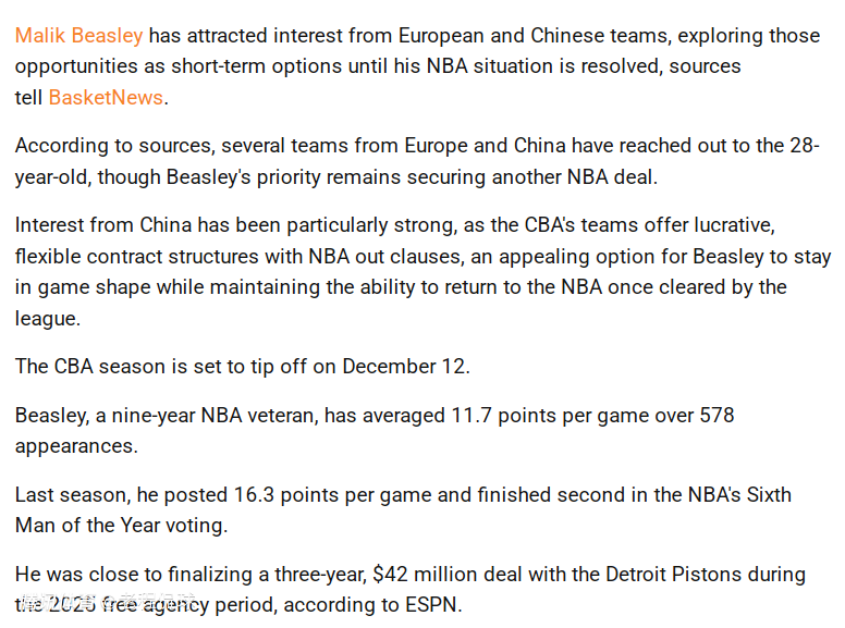 其中,来自中国的球队对比斯利表达了浓厚兴趣。由于CBA球队能开出丰厚且含有NBA跳出条款的灵活合约,这对于一边保持状态、一边在等待重返NBA的比斯利而言是一个很有吸引力的选择。