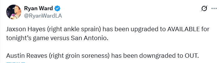 里夫斯与东契奇均缺席了上一场对阵开拓者队的比赛,尽管缺少两位头号得分手,湖人队仍取得了一场令人印象深刻的胜利。不过东契奇并未出现在今日的伤病报告中,确认可以出战,而里夫斯将至少再缺席一场。