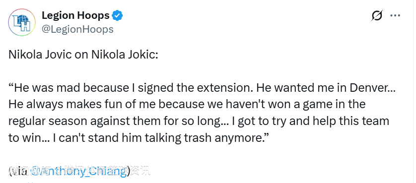 约维奇说道:“约基奇因为我签下续约合同而生气,他本来想让我去掘金。他总是拿我开玩笑,因为热火队常规赛这么久都没赢过掘金队了,我必须努力帮助球队赢球,我再也受不了他说垃圾话了。”