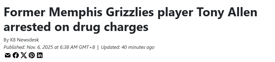 2025-11-06 08:20北京时间11月6日,据阿肯德州警方通报,前孟菲斯灰熊队球员托尼-阿伦在波因塞特县的一次交通检查中因涉毒指控被捕。