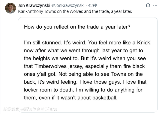 唐斯:时隔一年仍对被交易感到震惊 我依然深爱森林狼那帮兄弟