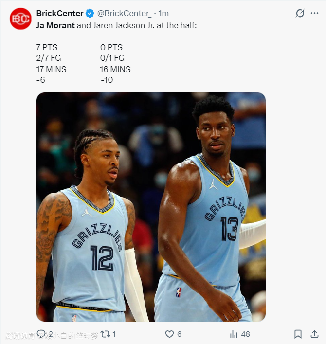 上半场打完莫兰特7中2+三分4中1拿7分5助攻2篮板;小贾伦半场1中0,拿0分,这两位核心的表现令人无奈。