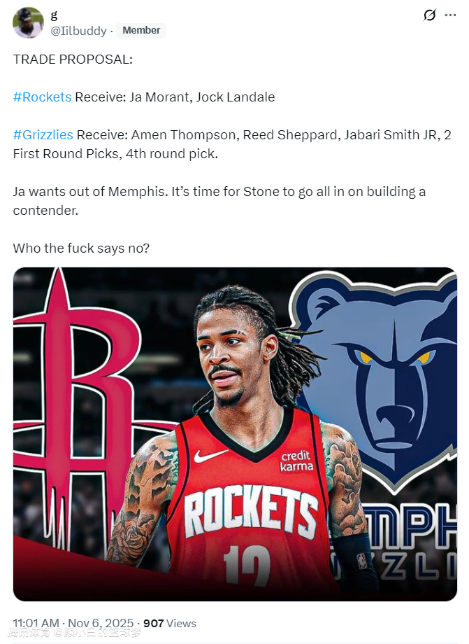 就在火箭与灰熊比赛时,一位灰熊球迷希望火箭用阿门、谢泼德、小贾、2个首轮签、4个次轮签去换莫兰特、兰代尔,评论区很多火箭球迷对他口诛笔伐。火箭五连胜了还需要莫兰特吗?莫兰特场外事件不断。
