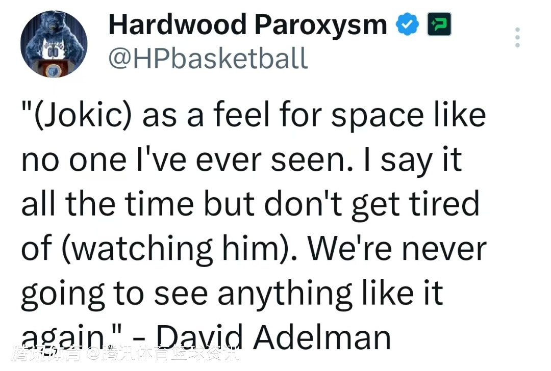 关于约基奇的表现,阿德尔曼说道:“约基奇对空间的感知能力,是我见过的球员里独一档的。我总这么说,但百看不厌。我们以后再也不会见到这样的球员了。”