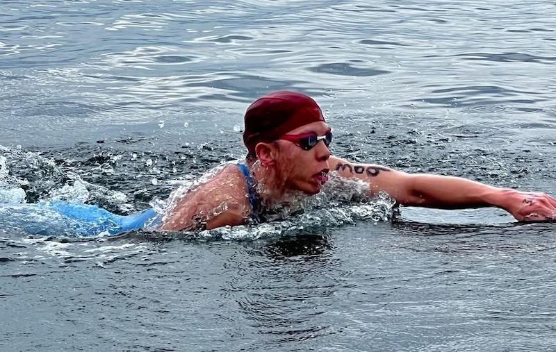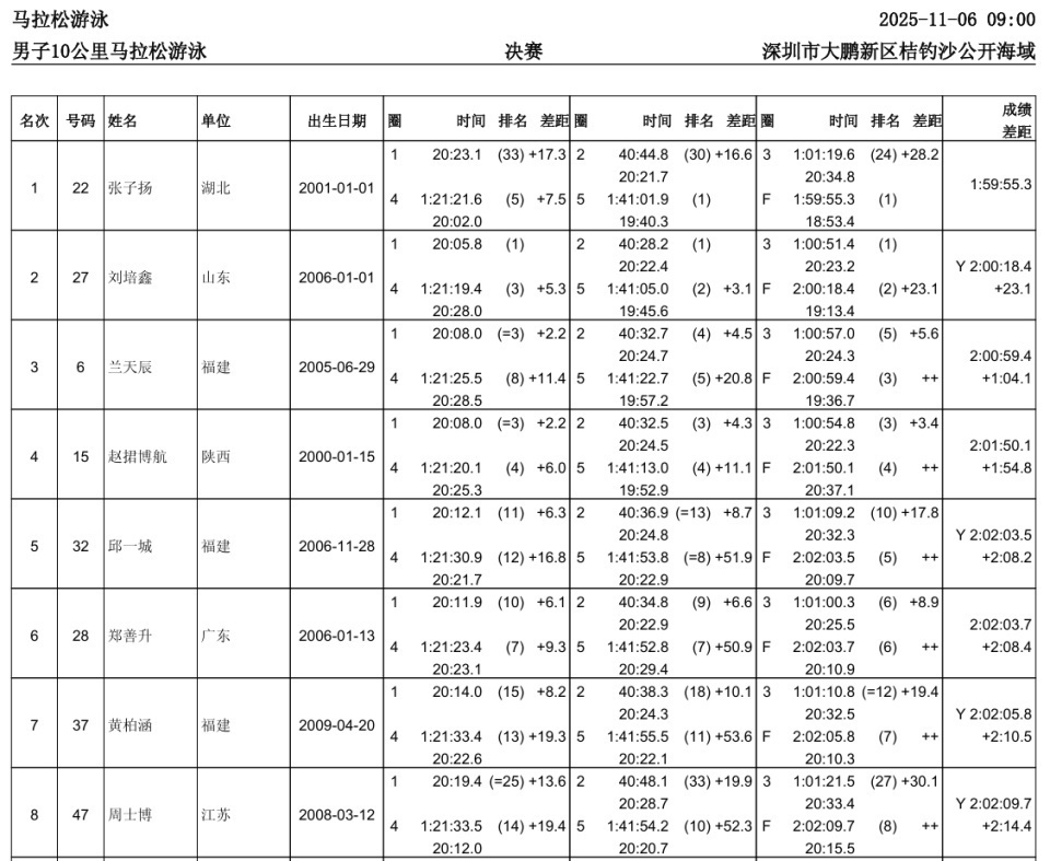 张子扬采用了非常好的跟游战术,前半场的都待在大部队里保持体力,第一个计时点游出20分23秒1,排在33位;第二个计时点也是30位;前半场1小时01分19秒6,位列第24。