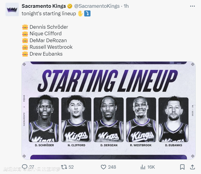 此役是威少国王生涯第一个三双,也是个人职业生涯第204次三双,360万威少又迎来生涯之夜。