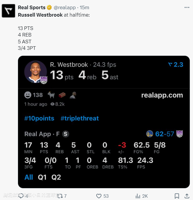第三节的威少依旧出色异常,单节2中2+罚球2中2拿到6分6篮板3助攻。三节打完19分10篮板8助攻,而且命中率高达70%,他的首次国王三双就要到来吗?
