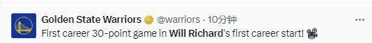 勇士队二轮秀理查德此役迎来自己职业生涯首次常规赛首发,而他拿到了30分,这是他职业生涯首次砍下30分,得分创职业生涯新高。