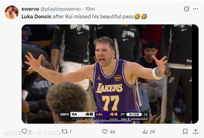 第二节东契奇给八村垒传了一个精彩的长传,结果八村垒篮下轻松的放篮没中,东契奇朝着八村做了一个鬼脸表示不满。