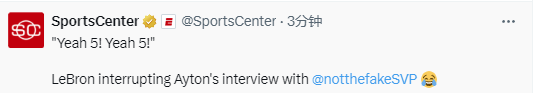 当艾顿进行采访时,詹姆斯两次高喊“耶,5连胜!耶,5连胜!”而艾顿的举动给逗笑了。