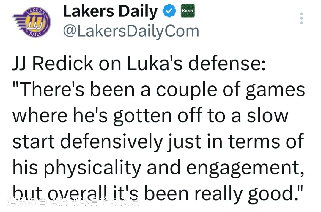 谈及东契奇的防守时,雷迪克表示:“有那么几场比赛,他在防守端开局会有些慢热,主要体现在身体对抗强度和防守投入度上,但从整体来看,他的防守表现已经非常出色。”