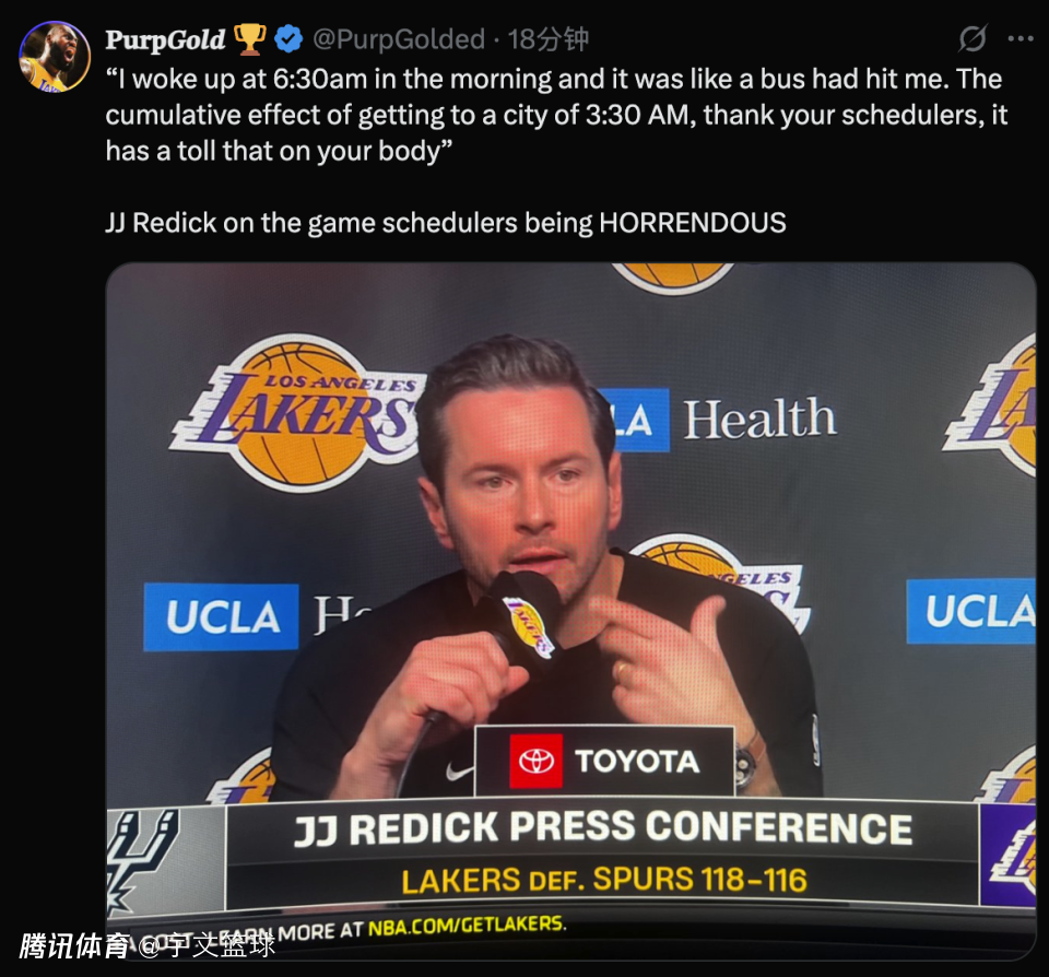 2025-11-06 15:50北京时间11月6日,NBA常规赛,湖人主场118-116险胜马刺,取得5连胜升至西部第2。赛后湖人主教练雷迪克表达不满,将矛头直指密集的赛程安排。