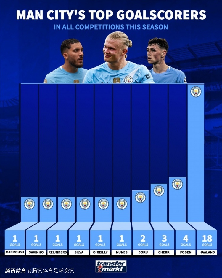 赛后,德国《转会市场》统计了曼城本赛季队内射手榜,数据显示,哈兰德一人打进