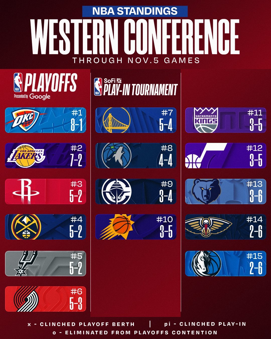 2025-11-06 17:40北京时间11月6日,湖人险胜马刺,收获五连胜,战绩7胜2负,升至西部第二;雷霆遭遇赛季首败,不敌开拓者,战绩变为8胜1负,以下是联盟最新排名——