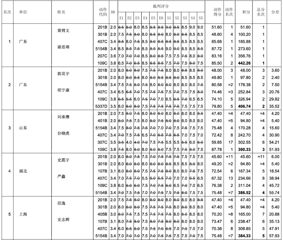 湖北史震宇/严鑫的稳定性胜出一些,但难度要明显弱一筹:自选动作要比山东组合低0.4,以386.52排在第四。上海搭档范逸/史志辉,天津组合莫璧翔/苏家杰以微弱分差排在第五和第六。