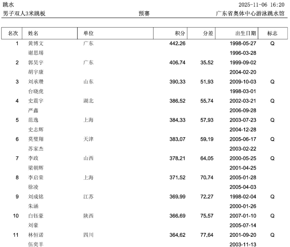 2025-11-06 17:40第十五届全运会跳水比赛继续进行,在男子双人三米板预赛里,两对东道主选手不负众望:黄博文/谢思埸以442.26领跑;郭昊宇/胡宇康以406.74位列第二,山东刘承瓒/台晓虎以390.33排名第三。
