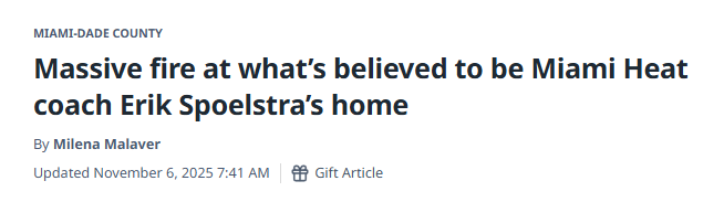 2025-11-06 21:00北京时间11月6日,据迈阿密媒体报道,热火队主教练斯波尔斯特拉的住所于当地时间周四清晨突发大火,现场一名助理教练已向当地新闻台证实了这一消息。