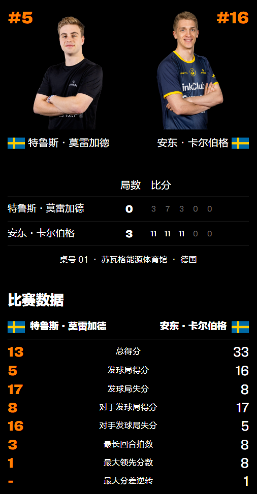 比赛开始后,卡尔伯格率先发动连得2分,莫雷加德随后追赶在1-4的位置等到了队友发球直接失误丢分,但很快继续被压制2-9被拉开差距,紧接着3-10出现局点,最终以3-11惨败先丢一城,完全被卡尔伯格束缚手脚。