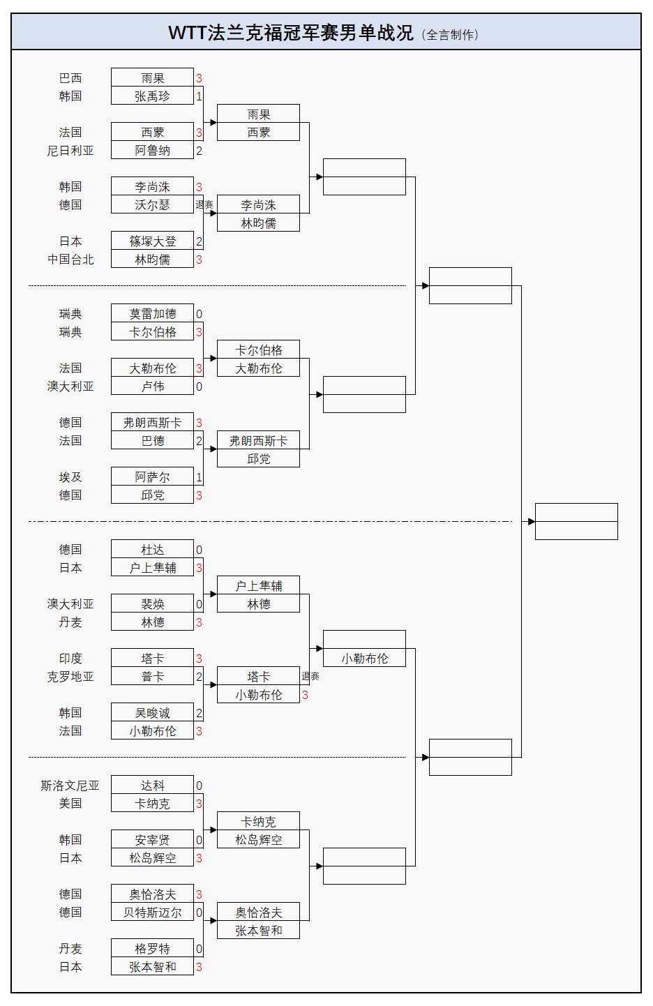 值得一提的是,印度选手塔卡已经因伤退赛,这就使得法国主力小勒布伦不战而胜率先晋级8强——男单比赛的最新进展如下: