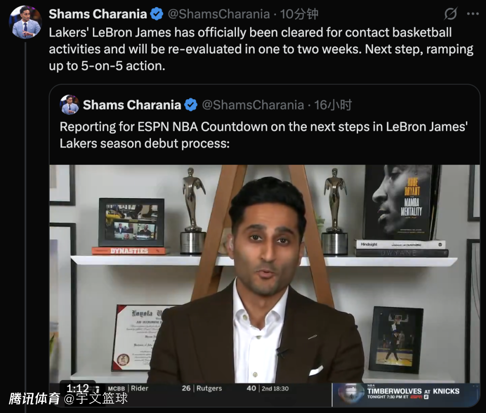 2025-11-07 01:20北京时间11月7日,湖人球星詹姆斯的伤情有了最新消息。据名记Shams报道,詹姆斯已经获得批准进行篮球对抗训练。詹姆斯将会在1-2周后接受重新评估,下一步他将逐步参与5v5的对抗训练,他的伤情算是有了突破性进展。