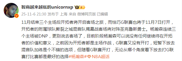 2025-11-07 01:20媒体人王健认为,杨瀚森目前没有任何继续待在开拓者队的价值和意义。无论从哪个角度看,打G联赛都是杨瀚森最好的选择。