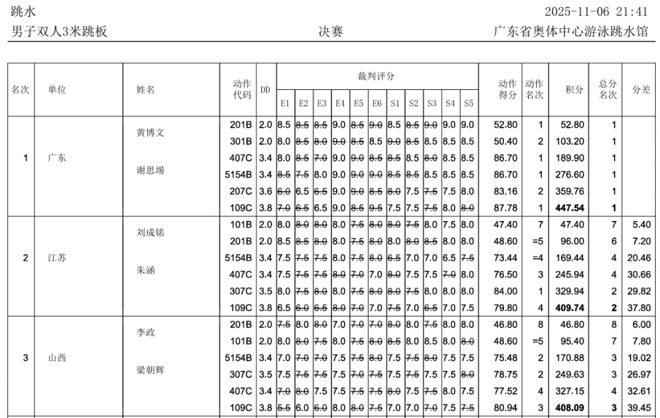 而每轮总分排名都是第一,最终以447.54分的成绩—解说称之为“世界冠军级表现”,为广东稳稳拿下这块金牌。