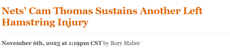 2025-11-07 05:50北京时间11月7日,据《纽约邮报》的布莱恩-刘易斯报道,在昨日对阵步行者队的比赛第一节,篮网后卫卡姆-托马斯左腿筋再次受伤,上赛季正是这一部位的伤病让他仅出战25场比赛。