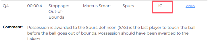 裁判报告显示,比赛还剩0.4秒,球权判给了马刺,凯尔登-约翰逊是球出界前最后一个碰球的球员,球权应该属于湖人队,这是一次十分关键的错判,湖人吃亏。