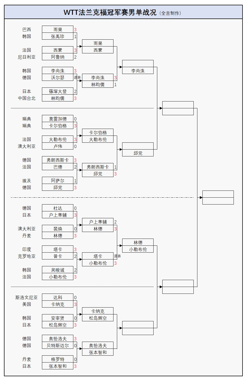 紧接着第二轮又有2位前八号种子出局,包括日本的大藤沙月、中国台北的林昀儒,而日本的2位世界冠军篠塚大登、户上隼辅已经全军覆没,先后在两轮比赛中被淘汰,以下为晋级详情: