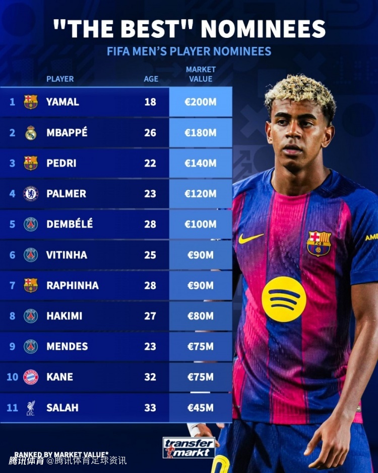 德转列FIFA最佳候选身价:亚马尔2亿欧居首 姆巴佩1.8亿欧次席