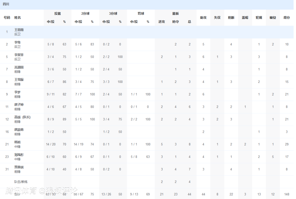 随后下半场,四川全运女篮有意增加更多替补阵容轮换,但全队仍持续高效的得分效率,最终,四川女篮以148-50狂胜山西98分。