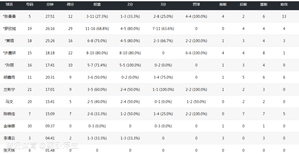 纵观全场比赛,江苏女篮全队5人得分上双,罗欣棫16中11得到29分,其中外线命中7记三分。张曼曼12分13助攻,黄琨16分,许晨妍22分8篮板,孙丽10分。
