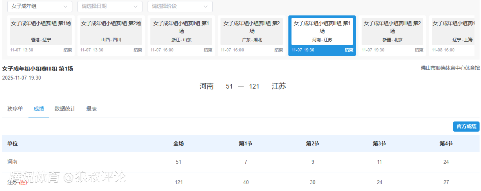 2025-11-07 22:00北京时间11月7日 全运女篮继续开打,江苏女篮121-51狂胜河南女篮取得开门红。