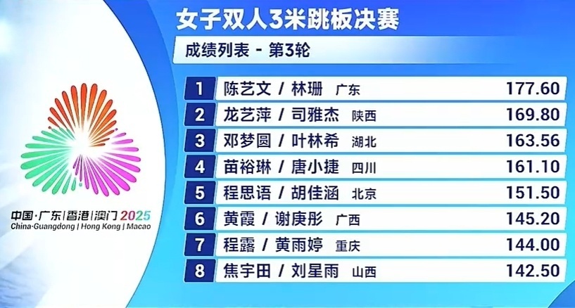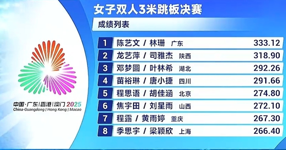 2025-11-07 22:00第十五届全国运动会跳水项目继续第六个比赛日的角逐:女子双人三米板决赛里,陈艺文/林珊表现突出,以333.12分为广东队再收一枚金牌!陕西组合龙艺萍/司雅杰以318.90摘银,铜牌归属湖北组合邓梦圆/叶林希,成绩是292.26。
