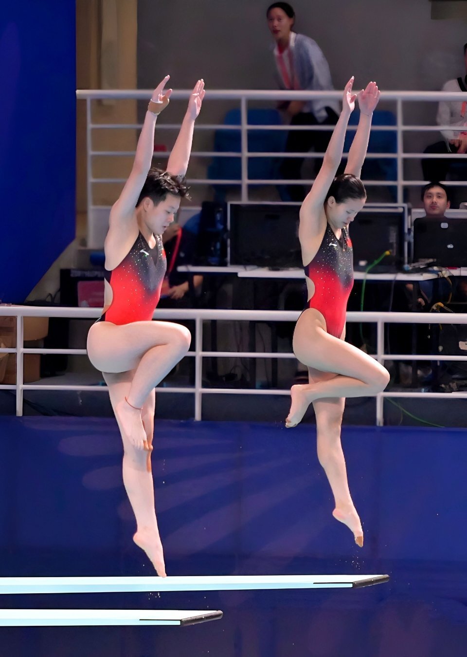 龙艺萍/司雅杰的107B动作质量很高,有效分都是8.0,拿到了74.40;同样跳这个动作的陈艺文/林珊个人技术非常突出,走板流畅,起跳有力,空中翻腾节奏和姿态完全一致,只是入水有轻微一前一后,拿到了78.12分。