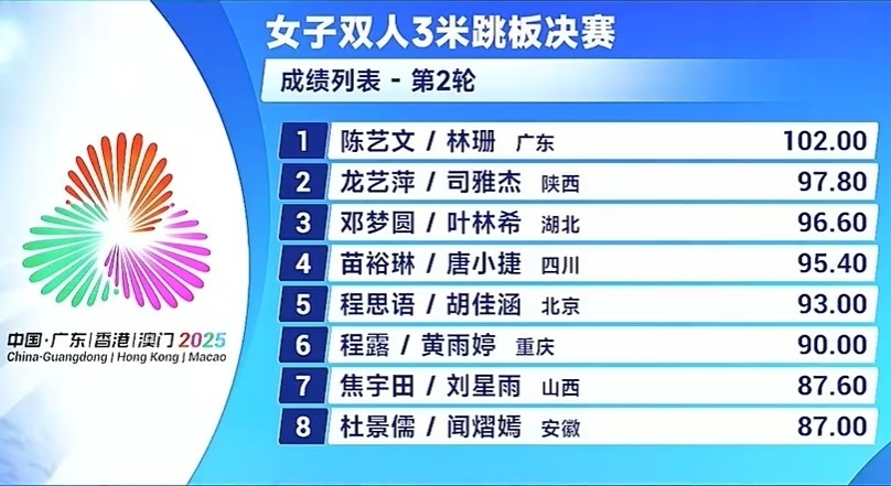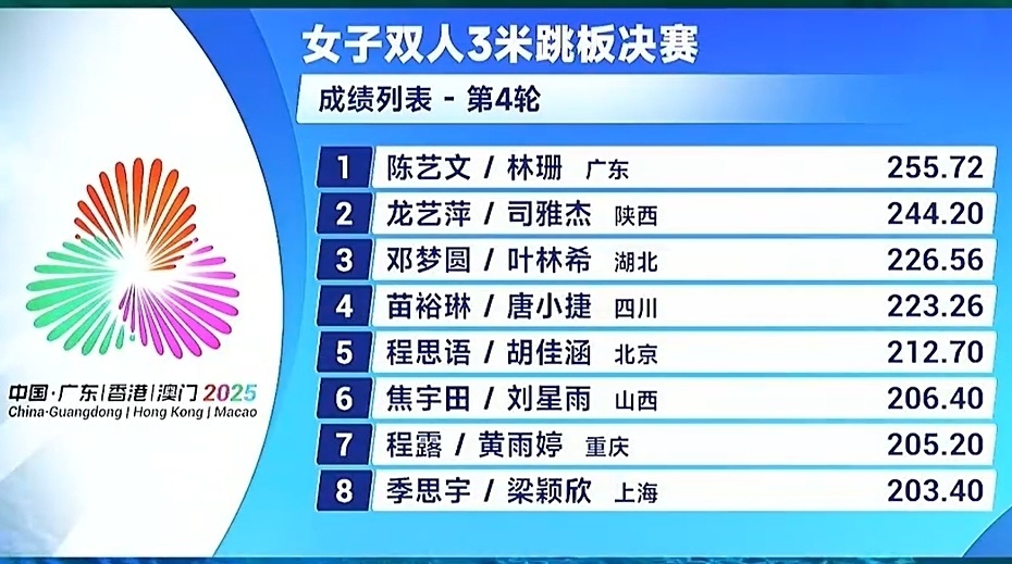 全运跳水女双三米板:陈艺文/林珊力压陕西组合折桂!湖北黑马摘铜