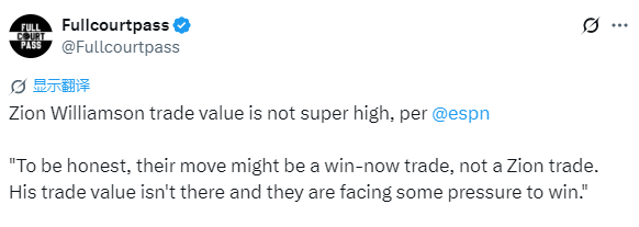 一位竞争对手球队的高管表示:“说实话,鹈鹕现在该做的或许是‘即战力交易’,而非‘锡安交易’,他的交易价值没达到预期,而且球队正面临赢球压力。”