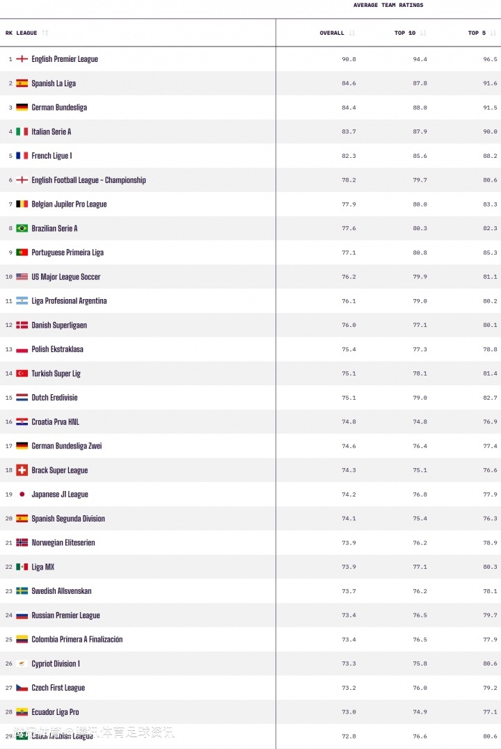 他的言论再度引发外界热议,而权威数据机构Opta也发布了最新全球联赛实力排名,数据显示——目前英超仍稳居世界第一,西甲、德甲、意甲和法甲分列前五;英冠凭借整体竞争力位居第六。