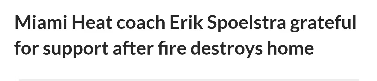 “房子里的东西都可以替换,”斯波尔斯特拉在热火对阵黄蜂队的比赛前表示,“就算有些东西无法替代,那又有什么关系呢?真正重要的是这些——家人、至亲,还有我们的狗也安全,谢天谢地。我们心怀感激,庆幸所有人都平安无事,一切都在往好的方向发展。”