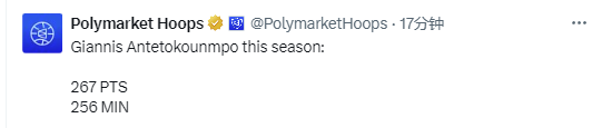 此外,根据Polymarket Hoops发布的数据统计显示,字母哥本赛季总计得到267分,而他的出场时间为256分钟,得分比出场时间还多,这样的情况也极为罕见。