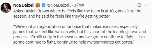 当被问到凯尔特人队目前的状况时,布朗说道:“无论是我们球队,还是球迷群体,都不是会找借口的类型,尤其是在那些我们认为本该赢下的比赛里。但这也是成长曲线和过程的一部分。现在赛季才刚开始,我们必须继续拼搏,我会一直拼下去,也会继续帮助队友们变得更好。”