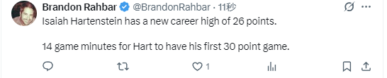 此前,哈尔滕施泰因职业生涯单场最高分为24分,而这场比赛,哈尔滕施泰因的状态火热,仅仅是上半场他就砍下了20分10篮板的两双数据。在第三节比赛中,哈尔滕施泰因越战越勇,不仅完成了里程碑,而且还有望继续刷新自己的纪录。