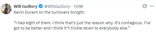23次失误独占8次!杜兰特:失误会传染 队友不用太刻意想着把球传给我