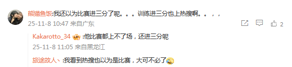 也有球迷质疑这样的训练集锦能上热搜莫名其妙。没有留意比赛,还以为是上场命中三分。