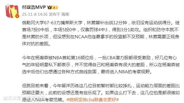 目前留洋的CBA新星中,无论是在欧洲打球的余嘉豪,还是在NCAA的林葳,他们的个人表现都比较挣扎。尽管杨瀚森在NBA同样处境不理想,但对于想进入NBA考察视野的余嘉豪和林葳而言,以他们目前的表现,的确是无法获得NBA球队认可和关注的。