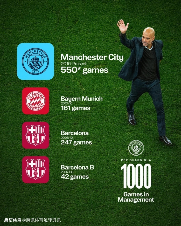 瓜帅千场执教分布:巴萨247场&拜仁161场 曼城至本轮达550场