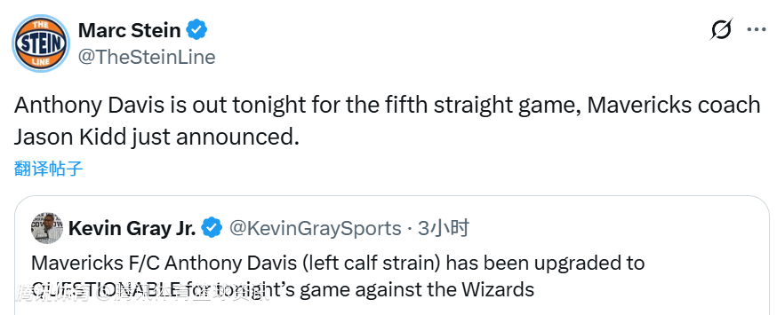 2025-11-09 07:00北京时间11月9日,NBA常规赛继续进行,独行侠将对阵奇才。本场比赛开打前,独行侠主帅基德透露了球队最新伤病情况,安东尼-戴维斯(左小腿拉伤)的状态尽管已升级为“出战成疑”,但将无法出战本场比赛,连续第五场缺阵。