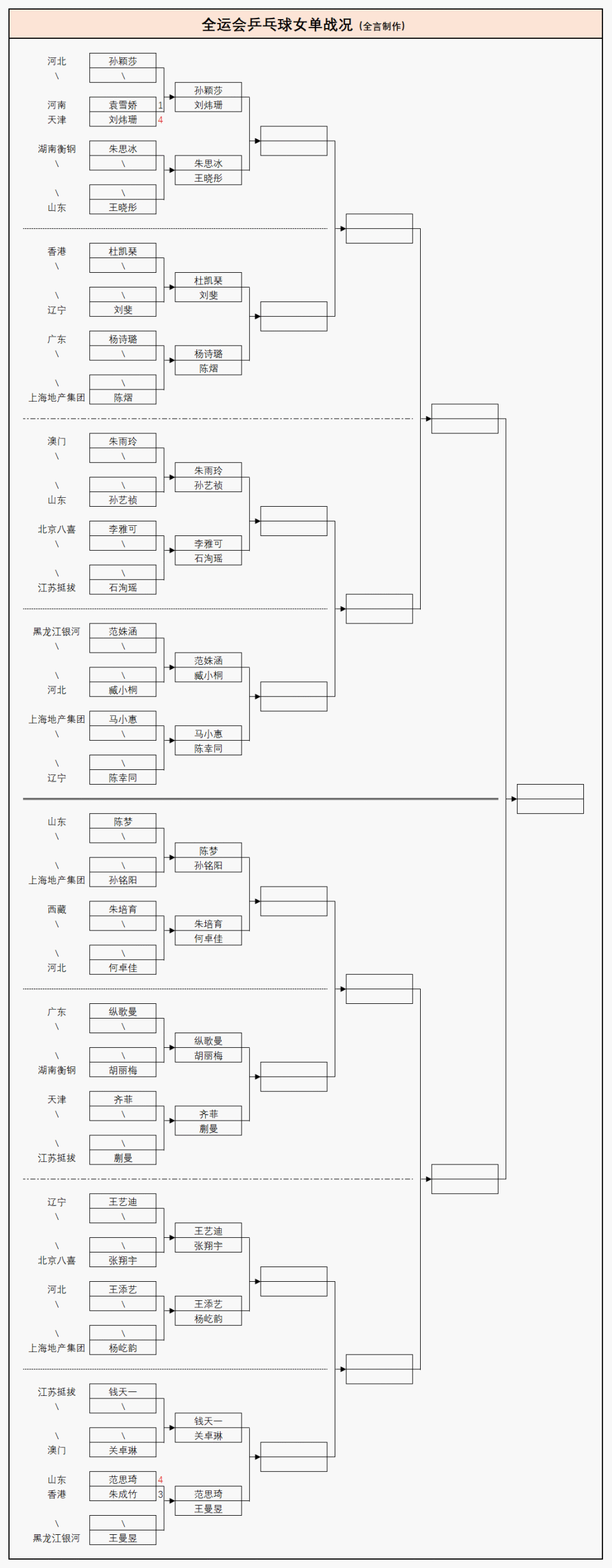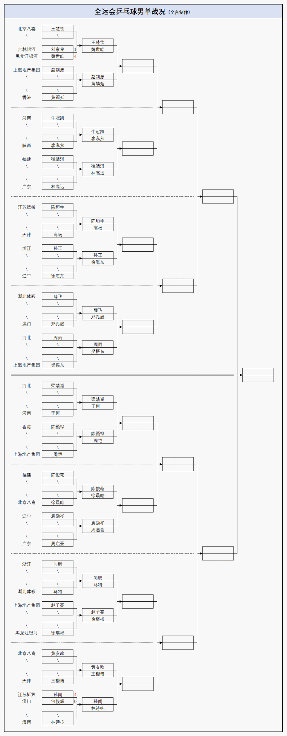 在本届全运会前两天的较量中,成年组单打首轮只有4场对决,现已全部结束,其中男子选手魏世皓、孙闻与女运动员刘炜珊、范思琦获得晋级,接下来将分别迎战王楚钦、林诗栋、孙颖莎、王曼昱,而单打32强的完整对阵安排也已经出炉,详情如下: