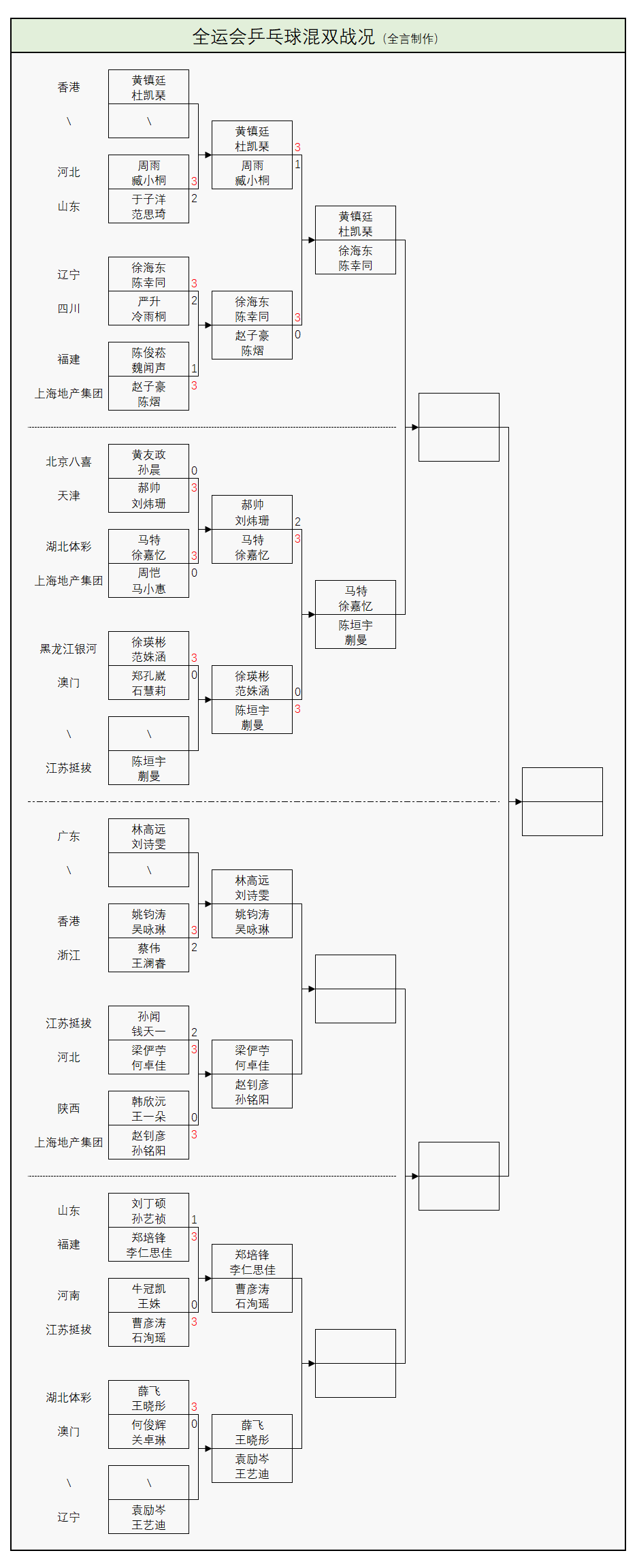 混双方面,第一轮进行了12场较量,世界冠军于子洋与搭档范思琦止步32强;第二轮已进程过半,世界冠军郝帅与队友刘炜珊止步16强,另外两位世界冠军陈幸同、蒯曼分别搭档徐海东、陈垣宇过关,目前8强已决出4席,以下为晋级形势: