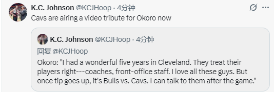 2025-11-09 09:30北京时间11月9日,NBA常规赛继续进行,骑士队对阵公牛队。此役,在休赛期被交易到公牛队的奥科罗重回骑士队主场,骑士队官方为他制作了致敬视频,球迷们也集体鼓掌,感谢了奥科罗在骑士队的贡献。